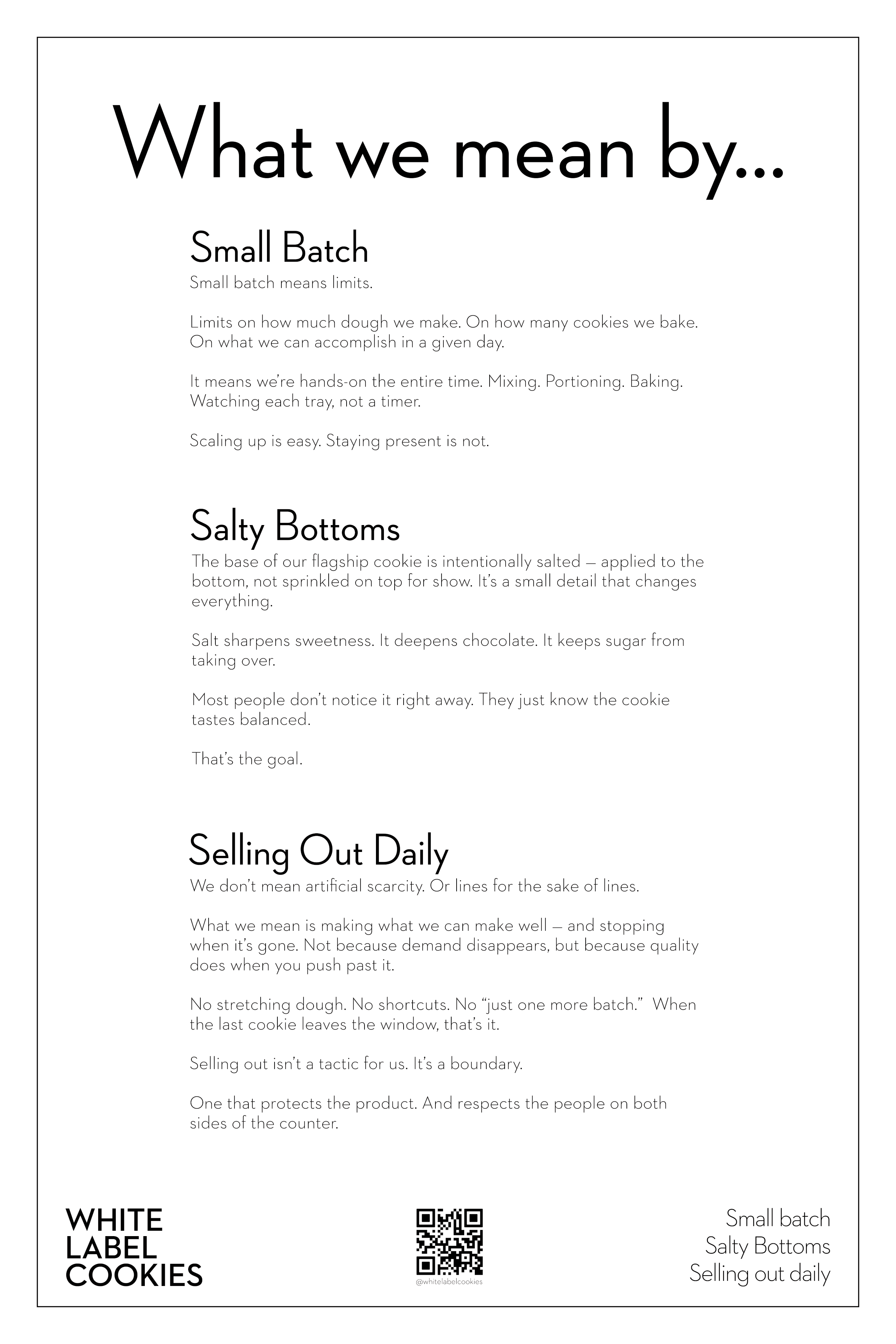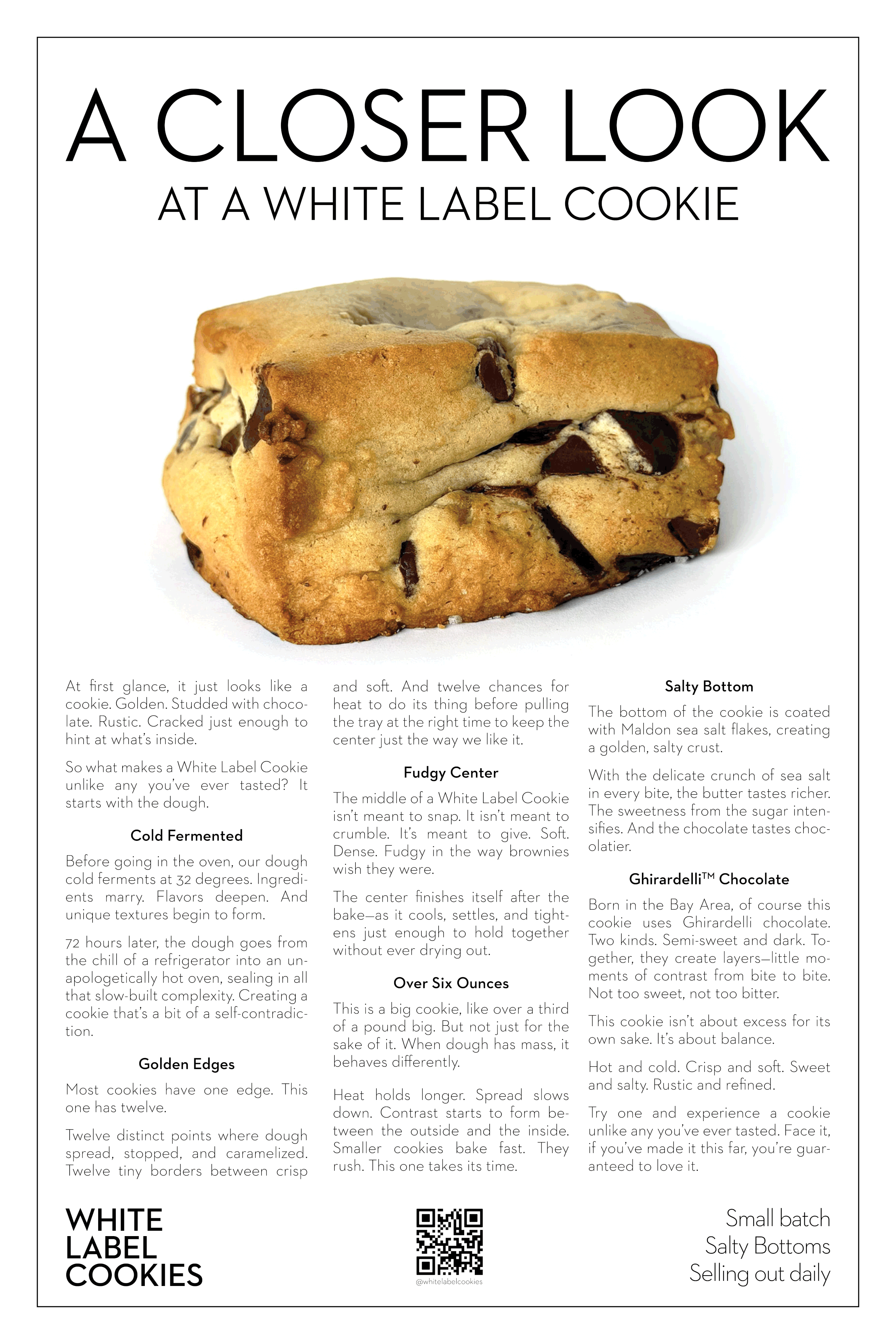 Before baking, our dough cold ferments for 72 hours – ingredients marry, flavors deepen, and unique textures begin to form. It then bakes hot and fast, sealing in all that slow-built complexity. Finally, each cookie rests for at least two hours, allowing flavors to mature and our signature fudgy center to fully develop. White Label Cookies are unlike any you’ve ever tasted.